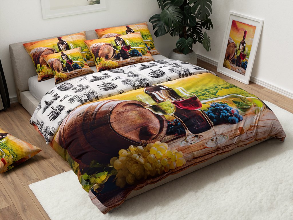 Genießen Sie das Gefühl von Ruhe und Romantik mit der Bettwäsche VINE, die Sie ins Herz der Weinberge versetzt. Der realistische 3D-Druck mit Weinmotiv, Gläsern und Fass im Hintergrund der untergehenden Sonne schafft eine einzigartige Atmosphäre. Die Bettwäsche besteht aus 100% Baumwolle, die Weichheit, Atmungsaktivität und Langlebigkeit garantiert.