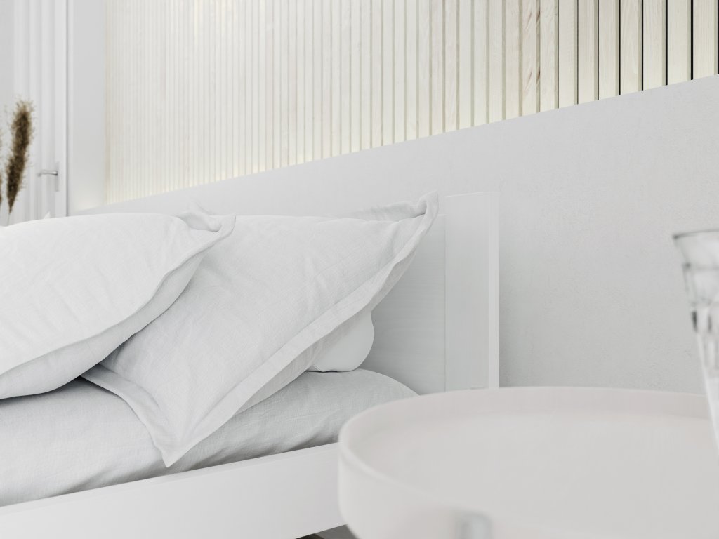 Ein modernes Interieur und klare Linien helfen Ihnen, ein Bett in Weiß zu gestalten. Diese neutrale Farbe ist seit vielen Jahren beliebt und kehrt wieder an die Spitze der Beliebtheit zurück. Sie wirkt frisch und luftig und lässt sich leicht mit anderen Farbtönen und auch dunkleren Farbtönen kombinieren. Das Schlafzimmer wird eine entspannende und ruhige Atmosphäre ausstrahlen.