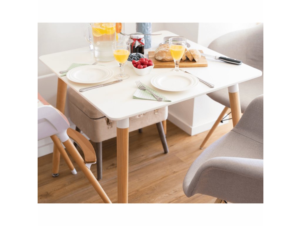 Im Interieur Werte wie Qualität, Präzision und Schlichtheit zu entwickeln, zahlt sich aus. In der Einfachheit liegt die Schönheit, das gilt doppelt für den skandinavischen Stil. Ein ausgeklügeltes Design inspiriert durch die nordischen Länder bringt Leichtigkeit, Energie und Luftigkeit in den Raum. Eine sanfte Farbpalette lässt den Raum optisch größer und heller wirken. Innenräume zeichnen sich durch Funktionalität und Klarheit aus. Skandinavische Esszimmer und Küchen schaffen einen großen offenen Raum voller Licht und Harmonie. Der Esstisch Didier 70 x 70 cm passt durch seine Abmessungen auch in kleinere Räume. Die weiße Platte und die Beine in natürlichem Eichen-Dekor zieren jedes Esszimmer. Scheuen Sie sich nicht, mit auffälligeren Accessoires und gepolsterten Stühlen zu kombinieren.