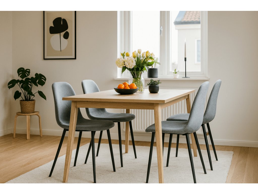 Ein entspannter Innenraum voller heller Farben und natürlicher Materialien. Den skandinavischen Stil werden Sie für seine Einfachheit, Zurückhaltung und Leichtigkeit lieben. In einem skandinavischen Esszimmer liegen Sie mit einem minimalistisch gehaltenen grauen Stuhl Fox richtig. Sparen Sie bei den Accessoires, ideal sind Elemente aus natürlichen Materialien wie Holz oder Metall. Ein massiver Esstisch und graue gepolsterte Stühle Fox mit Beinen in schwarzer Farbe bringen die gewünschte Leichtigkeit und Harmonie in den Raum. Ein Stil, inspiriert von den kalten nordischen Ländern, ist gemütlich und einladend. Genießen Sie die Zeit beim Essen mit den Liebsten.