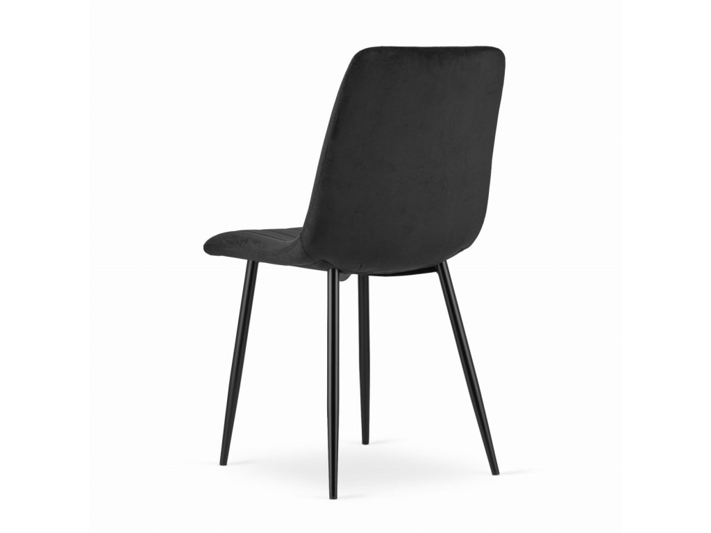 Die stabile Metallkonstruktion in schwarzem Design sorgt für Festigkeit und Langlebigkeit, während die Polsterung aus weichem Samtstoff Komfort beim täglichen Sitzen bietet. Die Rückenlehne ist mit feinen vertikalen Nähten versehen, die dem Stuhl Eleganz verleihen und einen gemütlichen, durchdachten Eindruck schaffen.