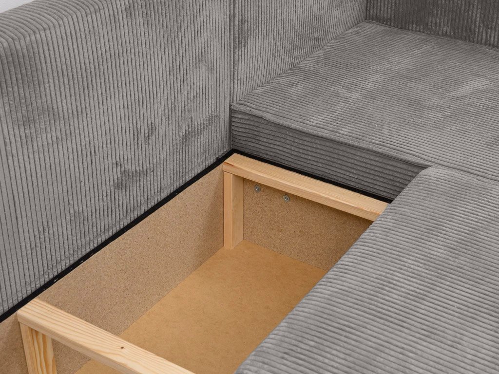 Das Sofa verfügt über einen Stauraum, der unter der Hauptsitzfläche verborgen ist. Dank dieser Funktion können Sie das Sofa leicht in ein geräumiges Bett für gelegentliches Schlafen oder Entspannen verwandeln. Sein universelles Design ermöglicht es, es in jede Ecke des Raumes oder dank der vollständig gepolsterten Konstruktion auch in die Mitte zu stellen.