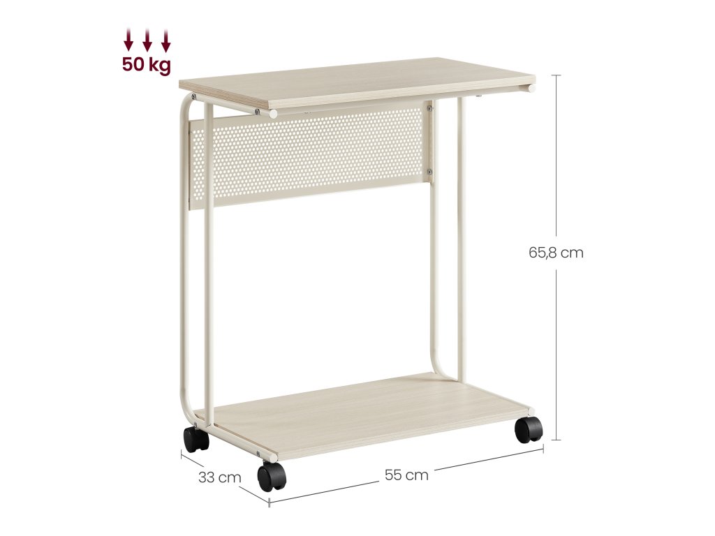 Keine Kompromisse mehr zwischen Praktikabilität und Ästhetik – dieser Tisch ist die ideale Lösung für alle, die Funktionalität mit durchdachtem Design schätzen. Dank der kompakten Maße passt er auch in kleinere Räume, während die Rollen eine mühelose Handhabung ermöglichen. Verwenden Sie ihn als mobile Arbeitsstation, Serviertisch bei Besuchen oder Nachttisch im Schlafzimmer. Seine Nutzung liegt ganz bei Ihnen – er wird schnell zu einem unverzichtbaren Bestandteil Ihres täglichen Lebens.