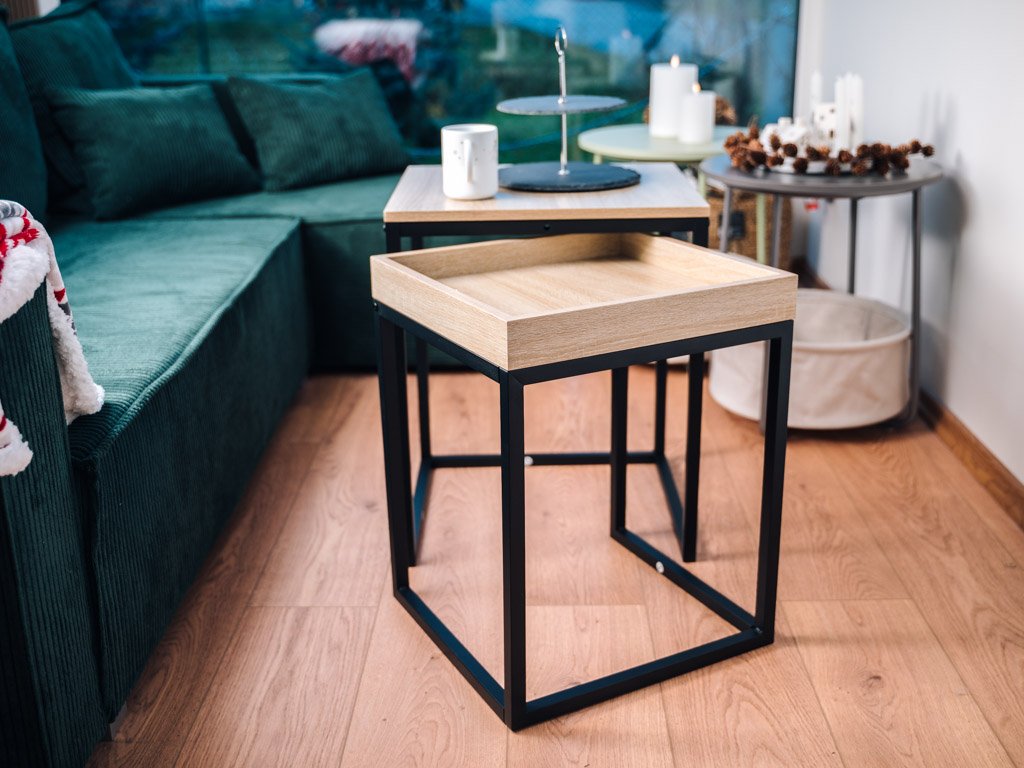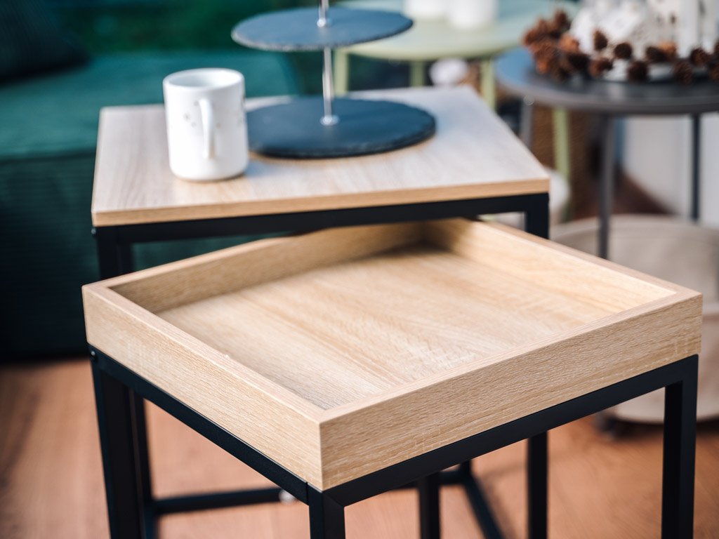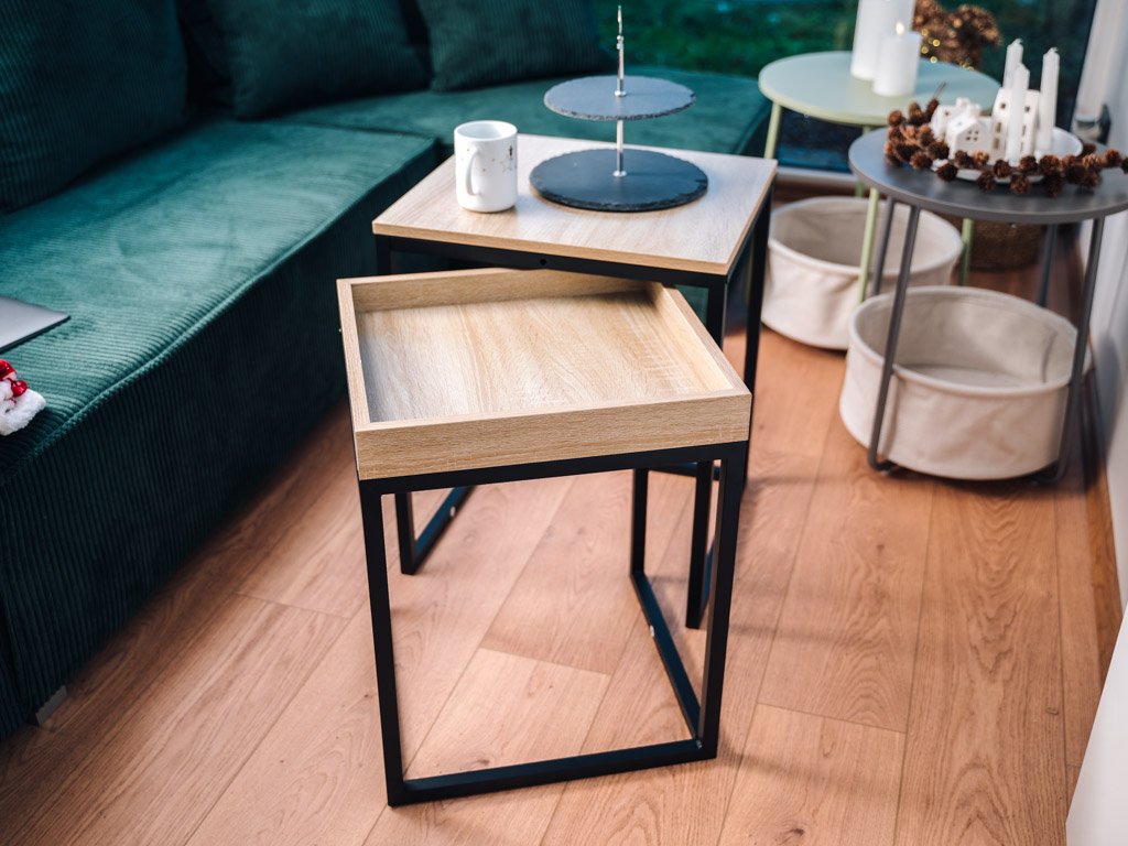 Verwandeln Sie Ihr Wohnzimmer in eine Wohlfühloase mit der cleveren Anordnung dieser Tische. Stellen Sie einen kleineren Tisch neben einen bequemen Sessel für eine Tasse Kaffee, ein Buch oder eine Duftkerze, während der größere Tisch sich hervorragend als Platz für Dekorationen, eine Vase mit Blumen oder eine Zimmerpflanze eignet. Kombinieren Sie die Tische für eine perfekte Atmosphäre mit gedämpfter Beleuchtung, wie einer Designerlampe oder einer Lichterkette. Dank ihrer Vielseitigkeit und der Möglichkeit, einen Tisch unter den anderen zu schieben, können Sie die Anordnung je nach Stimmung und Raum leicht ändern. Das Ergebnis? Eine praktische und stilvolle Ecke, die Sie zur Entspannung einlädt.