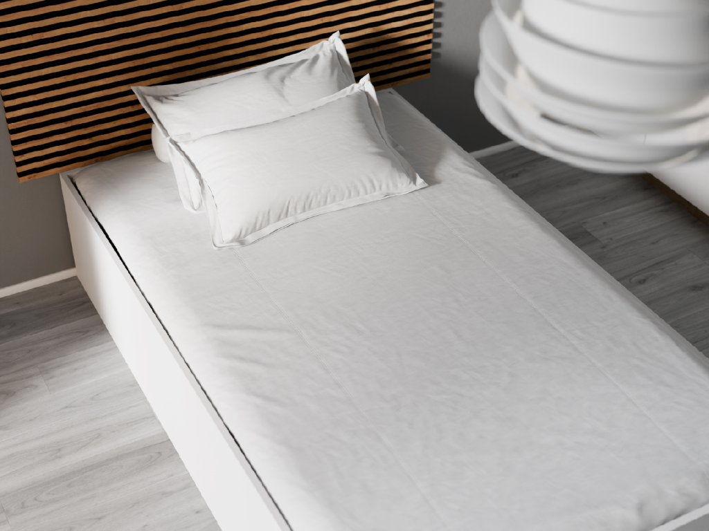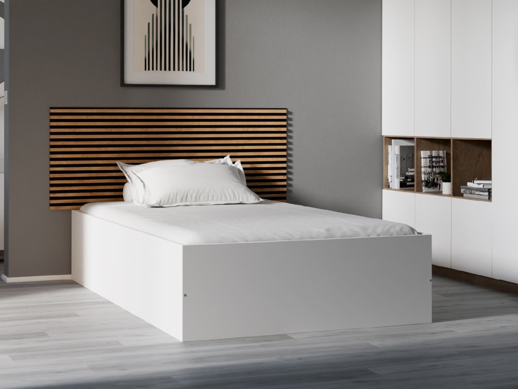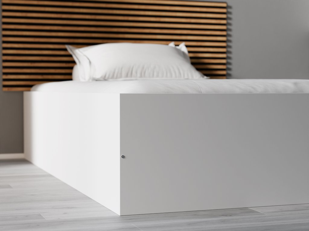 Schlicht und doch hochfunktional! Das minimalistische Bett Bella 120 x 200 cm im weißen Design ohne Kopfteil passt perfekt in jedes stilvolle Schlafzimmer. Helle Farben und regelmäßige Linien garantieren hohen Schlafkomfort. Das Kopfteil kann durch gepolsterte oder hölzerne Wandpaneele ersetzt werden.
