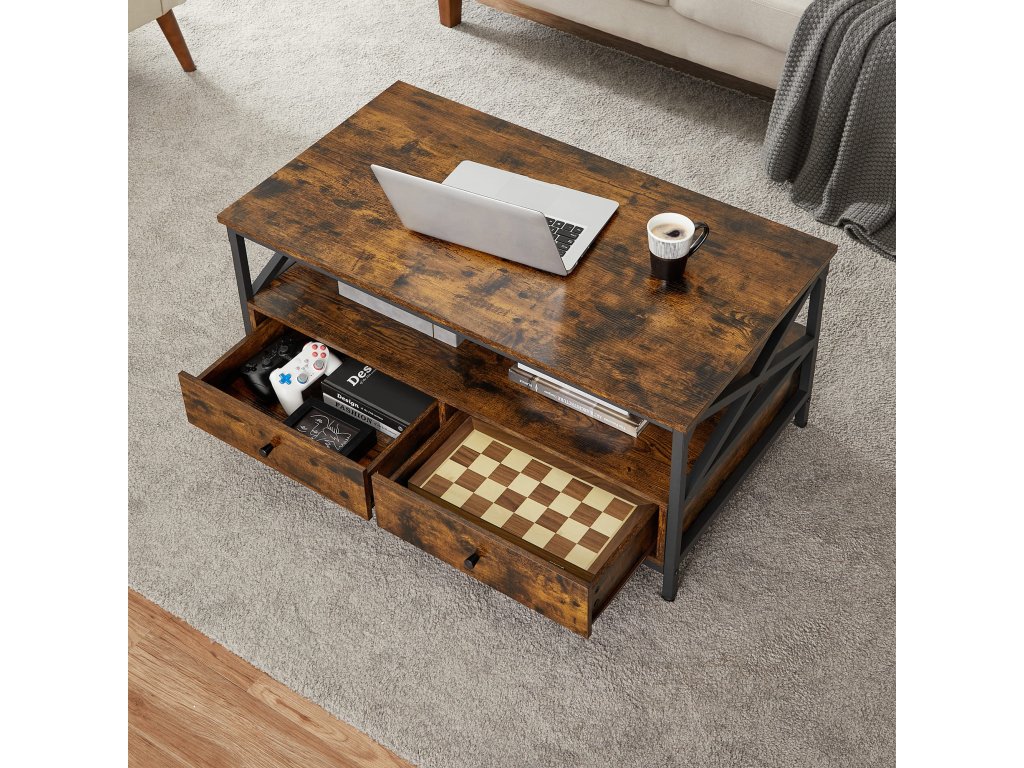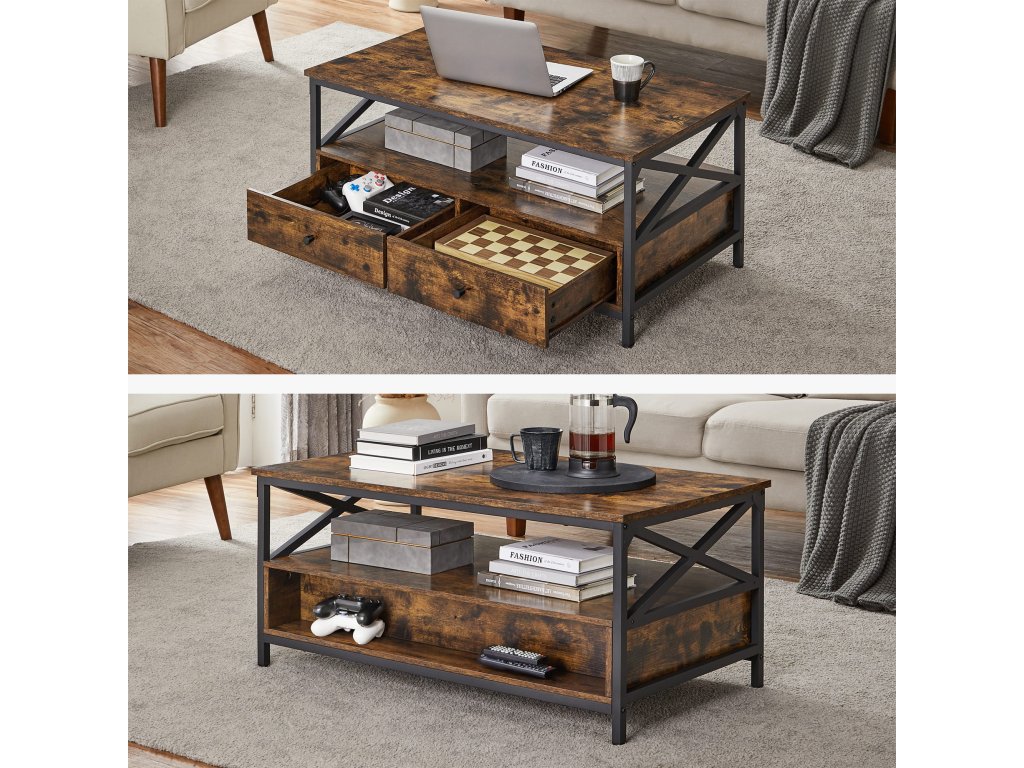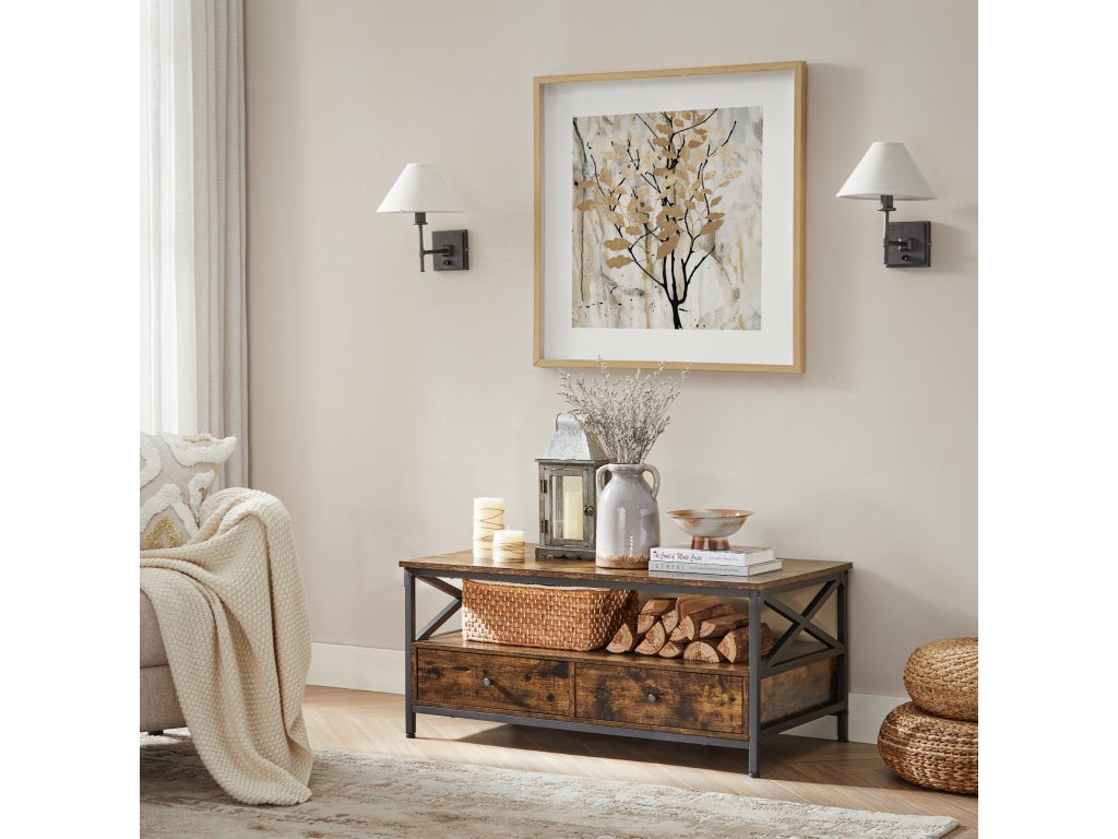 Ein stilvoller Couchtisch im industriellen Design bringt nicht nur visuelles Interesse, sondern auch Funktionalität in jedes Zuhause. Dank der geräumigen Ablagefläche und der Schubladen behalten Sie leicht Ordnung im Wohnzimmer. Ideal zum Aufbewahren von Fernbedienungen, Zeitschriften oder Brettspielen. Er passt hervorragend in moderne sowie rustikale Innenräume und schafft einen gemütlichen Ort, an dem Sie eine Tasse Kaffee, angenehme Gesellschaft oder Entspannung nach einem anstrengenden Tag genießen können.