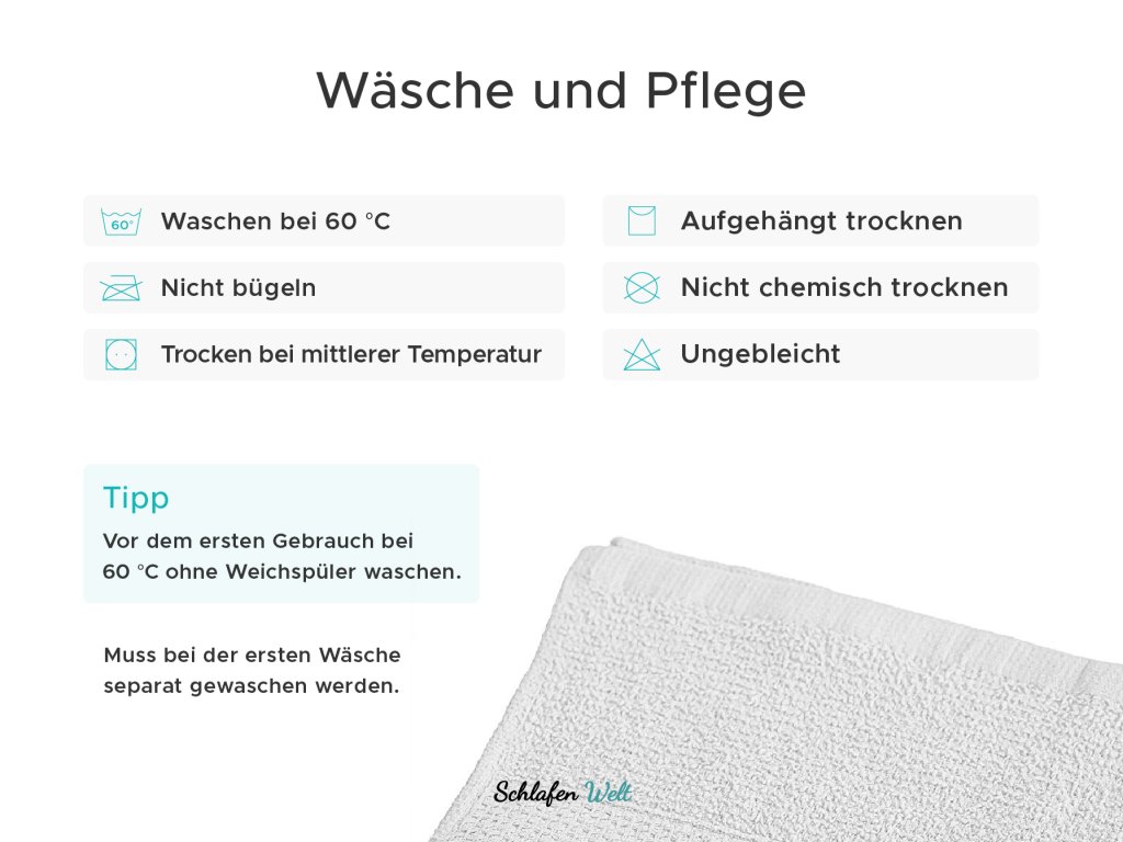 Um alle ursprünglichen Eigenschaften zu erhalten, wird empfohlen, Handtücher bei einer maximalen Temperatur von 60 °C zu waschen. Bei Baumwoll- und Mikrofaserhandtüchern ist das Waschen bei höheren Temperaturen möglich. Das Trocknen im Wäschetrockner kann nur bei niedriger Geschwindigkeit erfolgen, um die Fasern des Gewebes nicht zu beschädigen. Handtücher in hellen Farbtönen werden im Allgemeinen bei 60 °C gewaschen. Das Waschen reduziert die Anzahl der Milben und Mikroben.