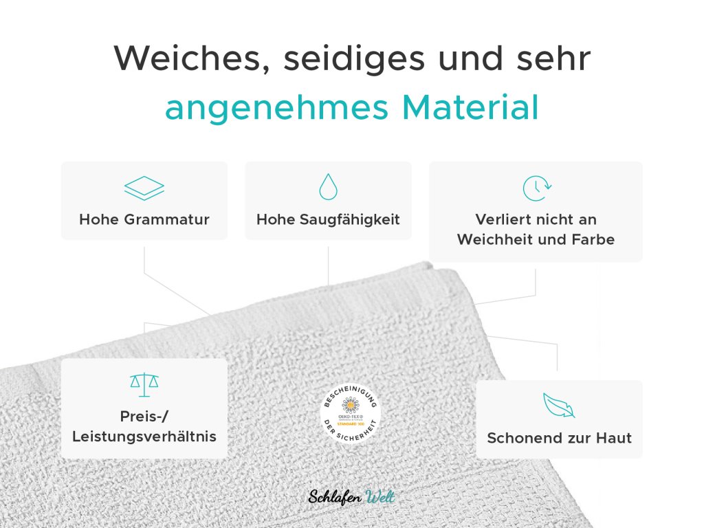 Die Saugfähigkeit wird von mehreren Faktoren beeinflusst, darunter die Art der Baumwolle, die Dicke der Fasern und wie fest die Fasern miteinander verbunden sind. Des Weiteren die Anzahl und Länge der Schleifen. Schlingengewebe sind dreidimensionale Textilien, bei denen die dritte Dimension aus Schlaufen besteht, die sich unter oder über der Oberfläche des Grundgewebes befinden. Die Länge dieser Schlaufen vergrößert die Oberfläche des Handtuchs, je größer die Fläche, desto höher die Saugfähigkeit des Handtuchs. Das Gewicht des Materials wirkt sich auch auf die Feuchtigkeitsaufnahme aus, es wird allgemein angegeben, dass ein Gewicht von über 450 g/m2 ein Qualitätsmerkmal ist. Vor allem Baumwolle zeichnet sich durch eine hohe Saugfähigkeit aus, aber auch andere Materialien wie Leinen oder Bambus. Eine tolle Kombination ist Baumwolle und Bambus, die auch unangenehme Gerüche absorbieren. Dieses Material hat eine bis zu 4-mal höhere Saugfähigkeit als Baumwolle allein.