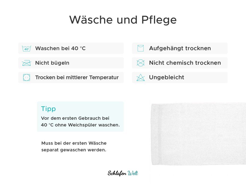 Es wird empfohlen, jedes neue Stück vor dem ersten Gebrauch bei 40°C zu waschen. Dies macht die Handtücher weich und beseitigt einen Hauch von Neuheit und möglichen Schmutz. Eine Temperatur von 40 °C ist für alle Arten von Handtüchern geeignet, niedrigere Temperaturen sind im Allgemeinen schonender. Höhere Temperaturen führen dazu, dass die Farben verblassen und die Handtücher abgenutzter aussehen.