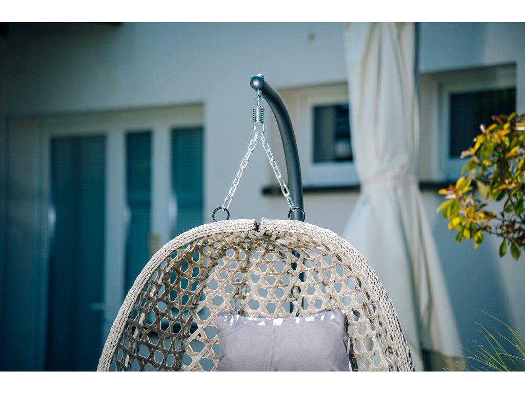 - Falls Sie den Ständer zum Aufhängen des Sessels verwenden, platzieren Sie ihn auf einer festen und ebenen Fläche, wo er stabil steht (z.B. Fußboden, geflieste Terrasse).