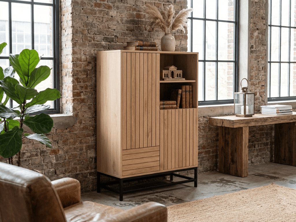 Dieser Aufbewahrungsschrank ist die ideale Wahl für die tägliche Organisation des Haushalts. Durch die Kombination aus geschlossenen Schränken, Schubladen und offenem Raum bietet er einen praktischen Ort zur Aufbewahrung von allem, was Sie griffbereit, aber dennoch ordentlich aufbewahren möchten. Er eignet sich hervorragend für das Wohnzimmer, den Flur und das Arbeitszimmer, wo er hilft, Übersicht und visuelle Ruhe zu bewahren. Der natürliche Eiche-Dekor in Kombination mit der Metallkonstruktion verleiht dem Interieur ein modernes und zeitloses Aussehen, das sich leicht mit anderen Möbeln kombinieren lässt.