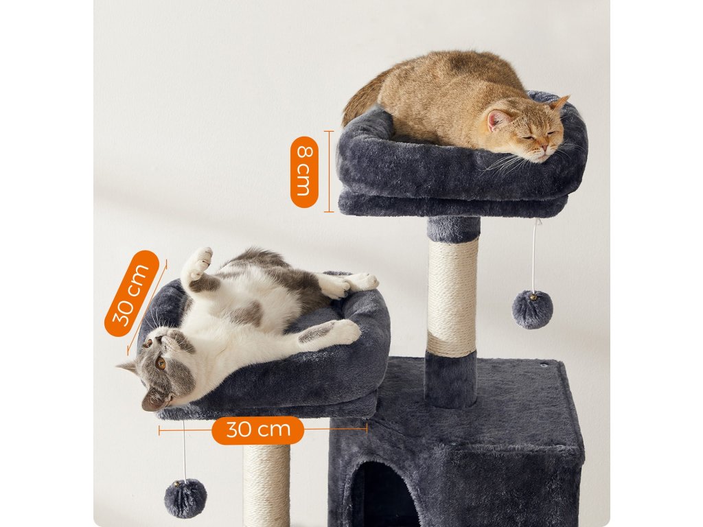 Dieser Kratzbaum für Katzen vereint Funktionalität und Komfort in einem eleganten Design. Dank der Kombination aus weichem Plüschstoff und strapazierfähigem Sisal bietet es einen idealen Ruhe- und Spielraum, den mehrere Katzen gleichzeitig zu schätzen wissen. Die stabile Konstruktion und die einfache Wartung garantieren eine lange Lebensdauer, während die neutralen Farben perfekt in jedes Interieur passen.