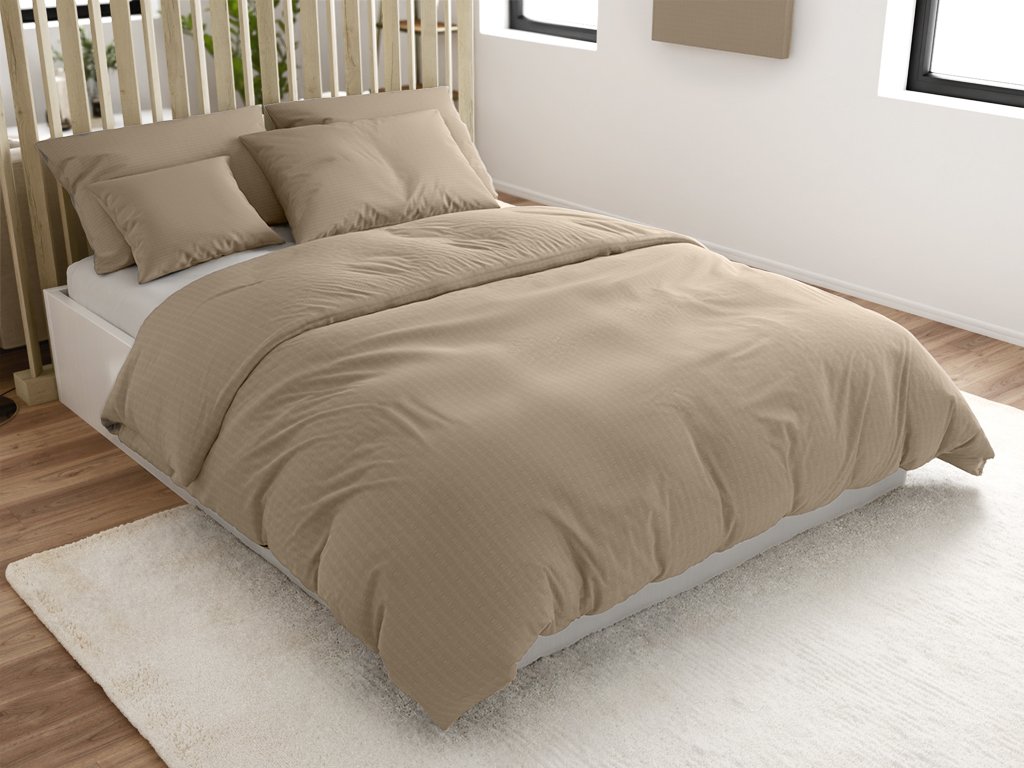 Ein praktisches Material, das mit den gleichen Eigenschaften wie Baumwolle ohne Bügeln überzeugt. Krepp ist das ideale Material für Kinder und Erwachsene zu jeder Jahreszeit. Im Winter wärmt es und im Sommer kühlt es angenehm, geeignet auch für Allergiker. Die einfache Pflege, Saugfähigkeit, Atmungsaktivität und Weichheit bleiben auch auf der typisch gekräuselten Oberfläche erhalten. Die wellige Oberfläche wird durch eine schonende Bearbeitung der Baumwolle erreicht, ohne deren Eigenschaften zu beeinträchtigen.