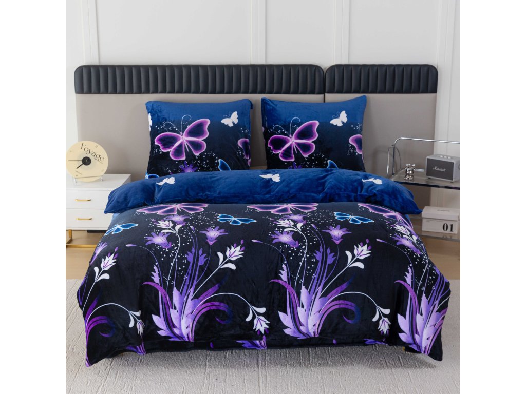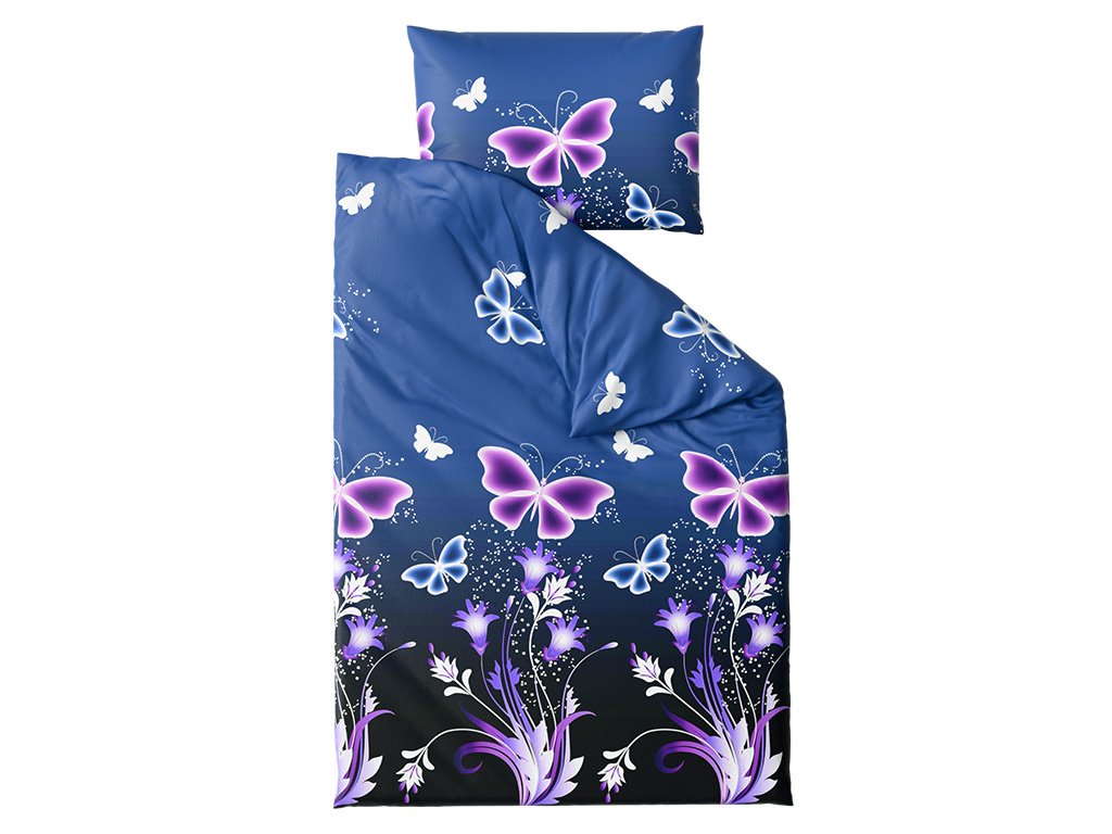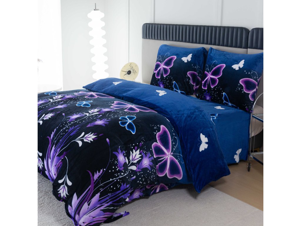 Sada mikroplyšového povlečení VIOLET BUTTERFLY tmavě modré + prostěradlo mikroplyš SOFT 180x200 cm bílé, dvoulůžko