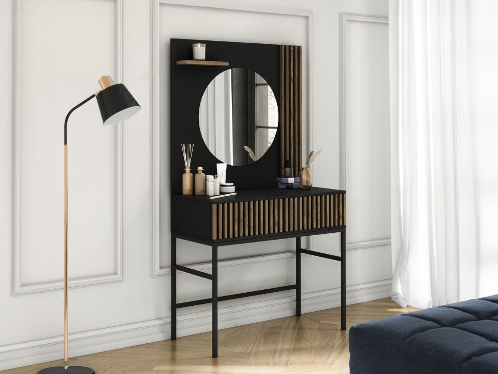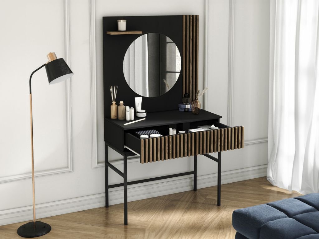 Schminktisch mit Spiegel und Schublade MEORATI 155x85 cm, Schwarz / Eiche Artisan