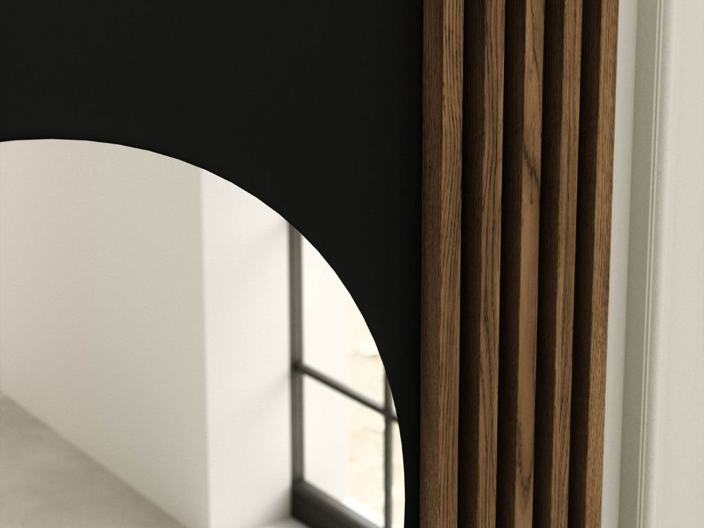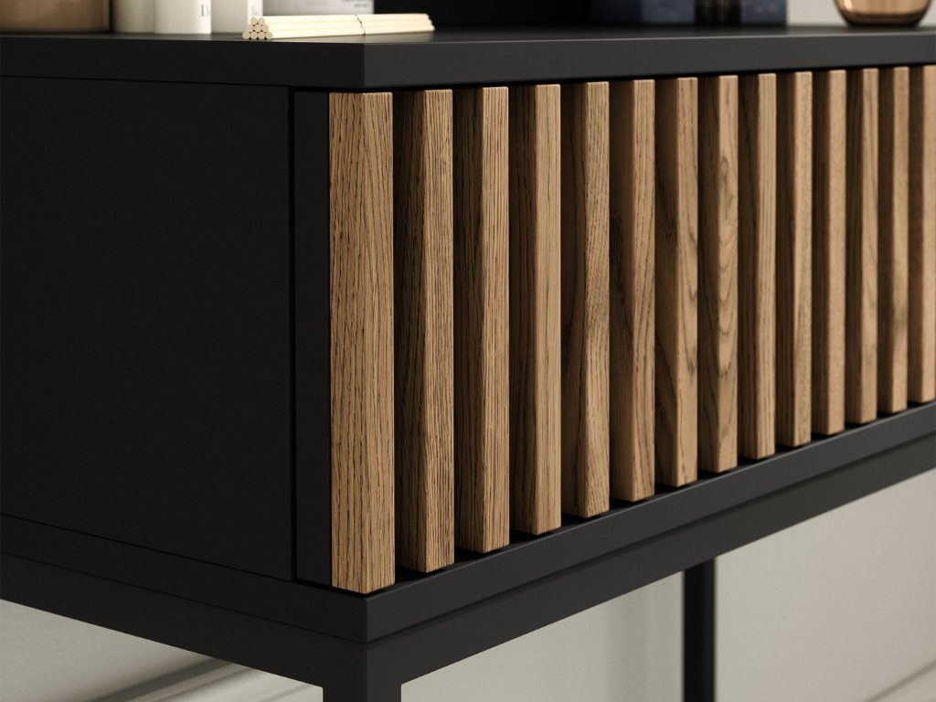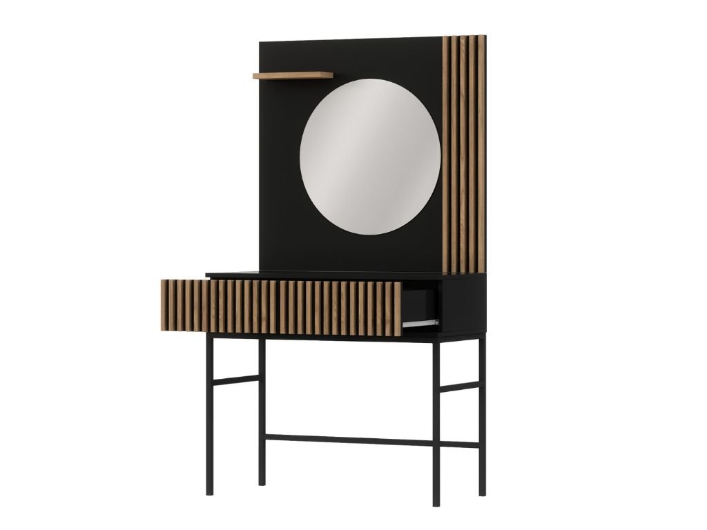 Dieser Tisch vereint Stil und Funktionalität, was ihn zur idealen Wahl sowohl für das Schlafzimmer als auch den Flur macht. Im Schlafzimmer dient er als eleganter Frisiertisch für eine übersichtliche Anordnung von Kosmetika und Schmuck, während er im Flur praktischen Platz für Schlüssel, Dekorationen oder weitere Notwendigkeiten bietet. Die Kombination aus Spiegel, Schublade und offenen Regalen sorgt für maximale Vielseitigkeit. Seine matte schwarze Oberfläche mit Eiche Artisan Dekor verleiht dem Interieur ein modernes und dennoch warmes Aussehen. Er sticht in jeder Ecke des Hauses hervor und wird schnell zu einem bevorzugten Bestandteil.