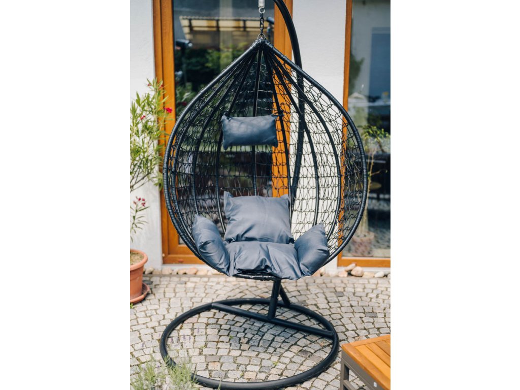 Schwarzer Hängekorb KOKON mit Gestell, graues Kissen