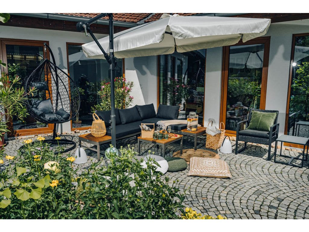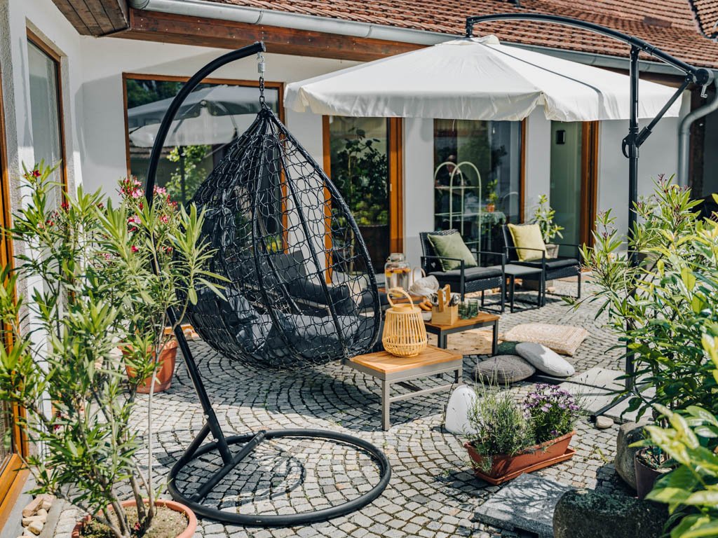 - Wenn Sie einen Stand zur Aufhängung des Sessels verwenden, platzieren Sie ihn auf einem ebenen und festen Untergrund, wo er stabil steht (z.B. Bodenbelag, gepflasterte Terrasse).
