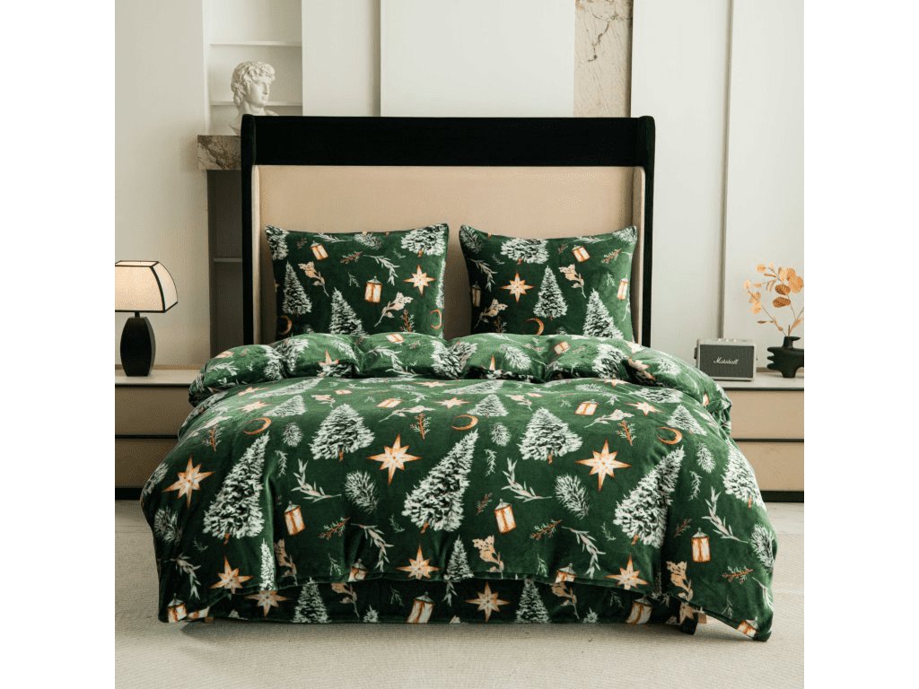 Set aus 2 Stk. Mikroplüsch-Bettwäsche GREEN CHRISTMAS grün + Mikroplüsch-Spannbettlaken SOFT 180x200 cm weiß, Doppelbett