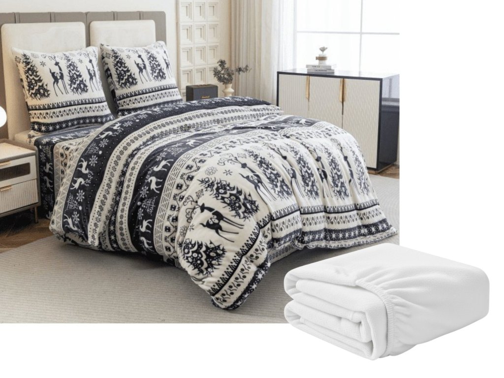Set Mikroplüsch-Bettwäsche WINTER DEER grau + Mikroplüsch-Spannbettlaken SOFT 180x200 cm weiß, Doppelbett