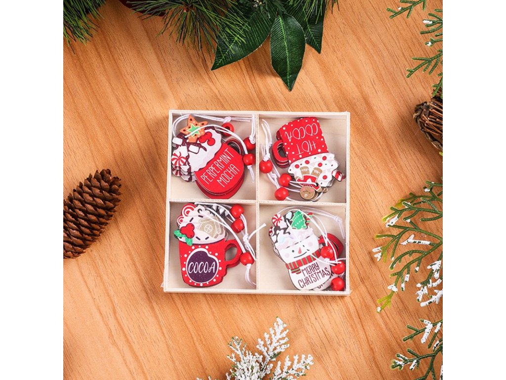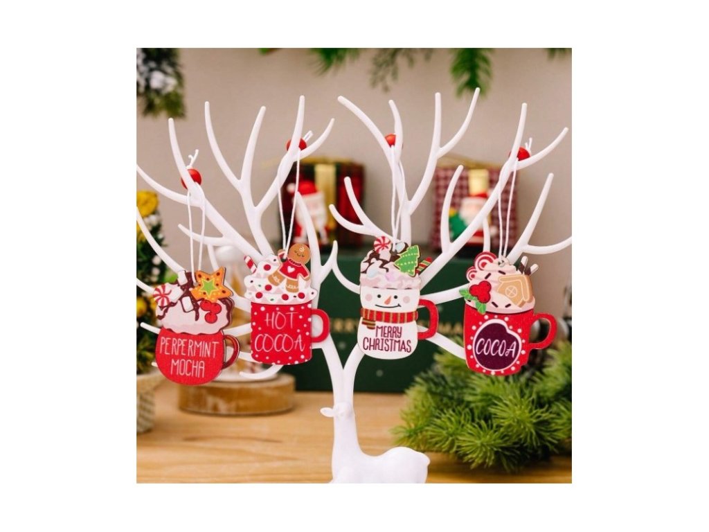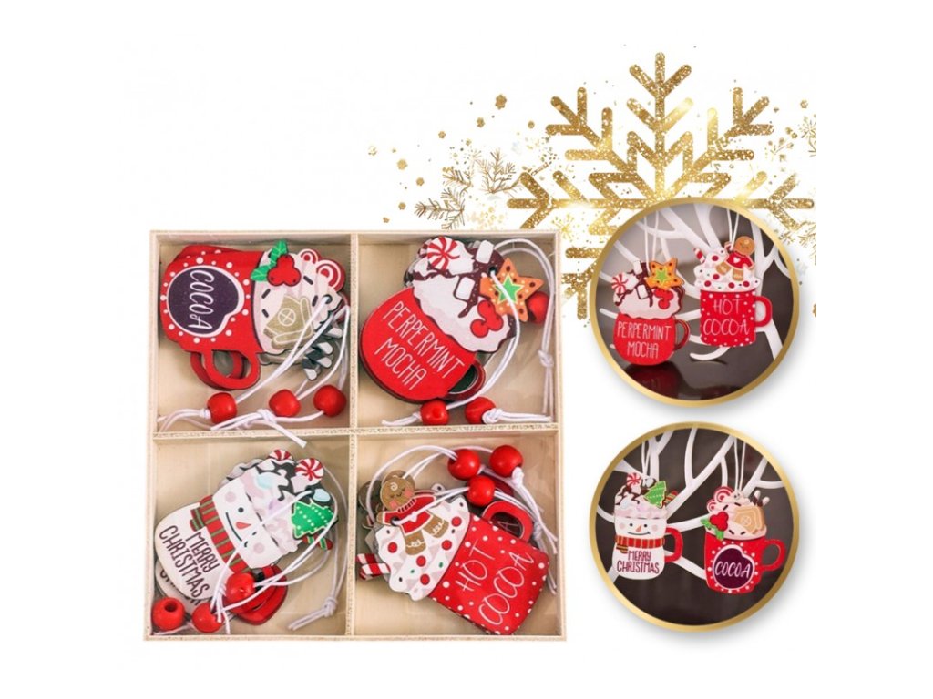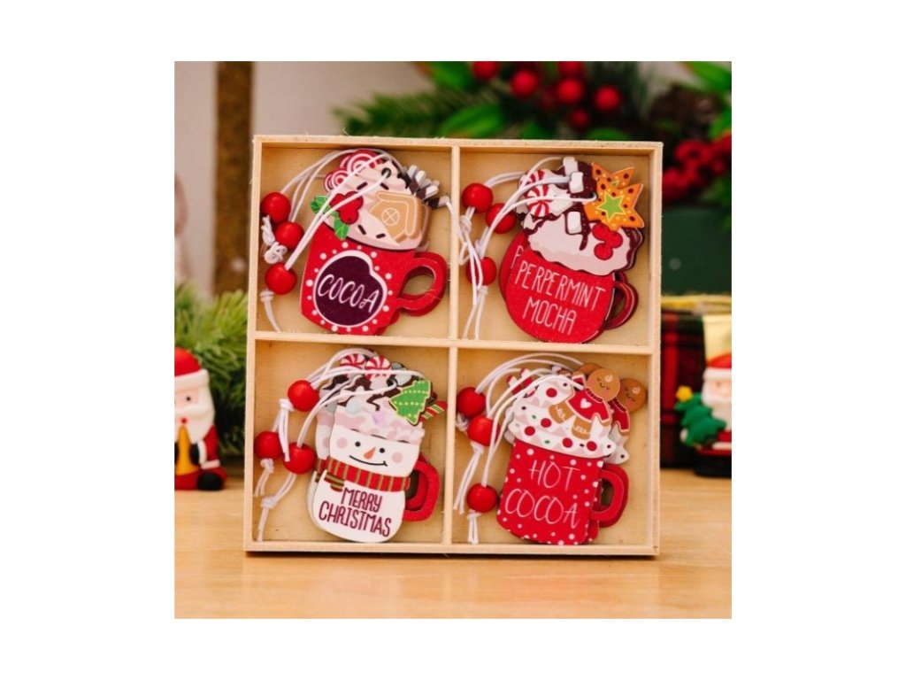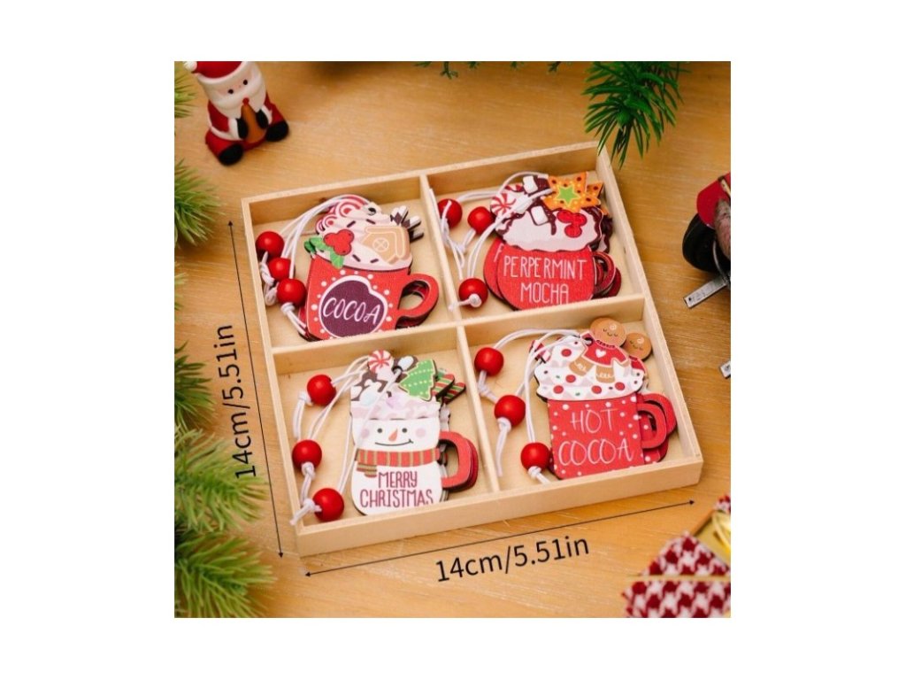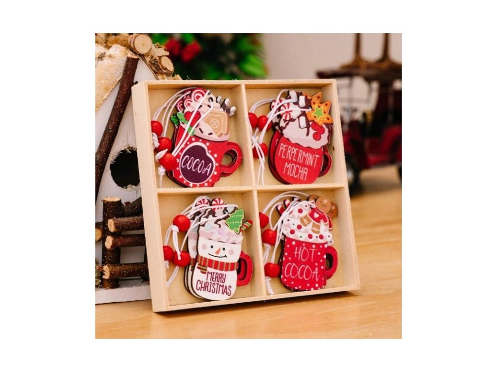 - Das Set enthält 12 Ornamente in verschiedenen Designs (Kakao, Pfefferminz-Mokka, Frohe Weihnachten, heißer Kakao).