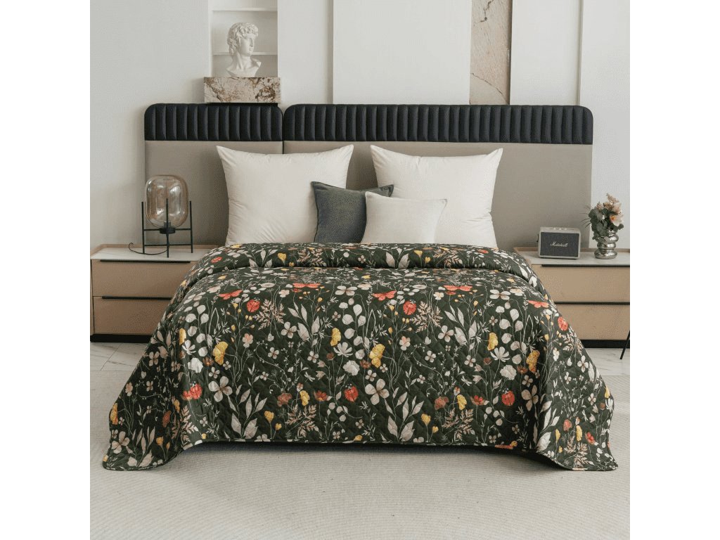 Bringen Sie einen Hauch von Natur in Ihr Schlafzimmer mit der Tagesdecke COLORFUL MEADOW in dunkelgrünem Produktdetails. Dieses elegante Stück beeindruckt auf den ersten Blick mit einem reichen Blumenmuster, das wie eine gemalte Wiese voller blühender Blumen aussieht.