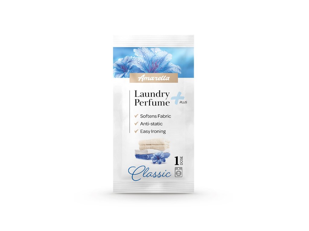 Wäscheparfüms AMARELLA im praktischen einmaligen 10ml Sachet sind die ideale Lösung für die tägliche Wäschepflege und für den Einsatz auf Reisen oder im Urlaub. Sie vereinen intensiven Duft mit praktischen Vorteilen – sie verleihen Textilien langanhaltende Frische, Weichheit und Tragekomfort. Eine Dosis verleiht den Fasern so viel Frische, dass Kleidung, Handtücher und Bettwäsche nach dem Trocknen und während des Tragens frisch bleiben. Darüber hinaus wirkt es antistatisch, erleichtert das Bügeln und hilft, Knitterfalten zu reduzieren. Einmalige Verpackung ist sofort einsatzbereit und bietet eine schnelle Möglichkeit, Ihre Wäsche jederzeit und überall duftend und gepflegt zu haben.