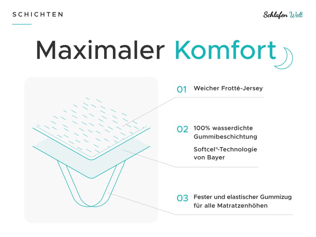 Matratzenschonerist wichtiger als Sie denken. Jeder Mensch, ob Kind oder Erwachsener, schwitzt von Natur aus. In der Nacht schwitzen wir bis zu einem Liter Schweiß, der in die Bettwäsche und den Matratzenkern eindringt. Der Matratzenschoner erhöht die allgemeine Hygiene des Bettes. Darüber hinaus schützt es vor mechanischen Beschädigungen, Schmutz, Milben, Schweiß und Urin. Dies ist ein großartiger Helfer für Kinderbetten oder erste Betten. Sie ist auch für Erwachsene als gewöhnlicher Matratzenschoner geeignet, für ältere Menschen oder für Personen, die lange bettlägerig sind. Der wasserdichte Matratzenschoner bildet eine schützende und flüssigkeitsdichte Schicht. Sie brauchen keine Angst zu haben, auf einer Plastikfolie zu schlafen, denn die oberste Schicht des Matratzenschoners besteht aus Mikrofaser, die sanft zur Haut ist und sich angenehm anfühlt.