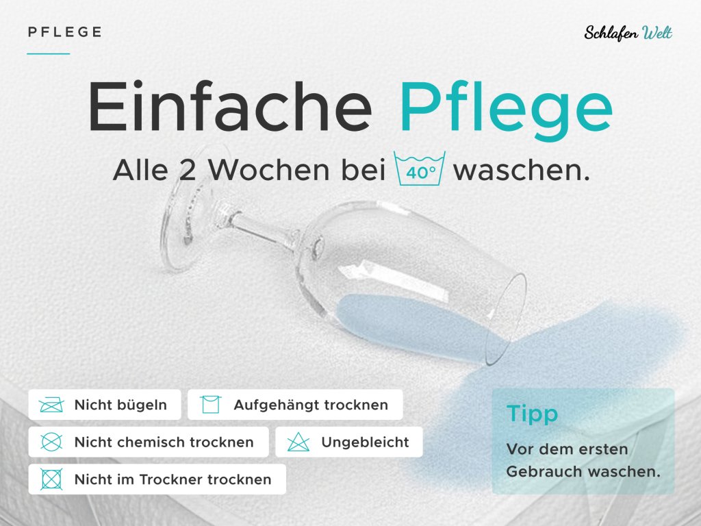 Die Pflege von Matratzenschonern ist denkbar einfach. Waschen und trocknen Sie den Schoner vor dem ersten Gebrauch gründlich. Um die gewünschten Eigenschaften, insbesondere die Dichtigkeit, zu erhalten, empfehlen wir eine Waschtemperatur von maximal 60 °C. Wenn Sie die Bettwäsche regelmäßig wechseln, waschen Sie auch den Schoner, idealerweise einmal alle 14 Tage. Nach dem Trocknen sollte der Matratzenschoner an der Luft trocknen, die Verwendung eines Wäschetrockners wird nicht empfohlen. Nicht auskochen, bleichen oder andere chemische Produkte verwenden. Die Oberschicht aus Mikrofaser muss nicht gebügelt werden. Nach dem Waschen und Trocknen ist es wieder hygienisch einwandfrei und einsatzbereit.