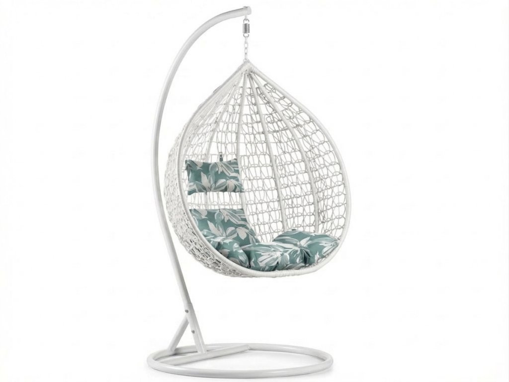 Weißer hängender Stuhl KOKON mit Gestell, grün-weißes Kissen